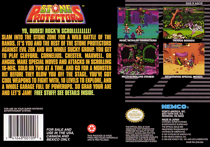 | __long_description | Stone Protectors is a an action game where each character has different weapons, all from melée to long-range weapons such as bazookas and guns. A kingdom built by crystals is under attack by the Saurians. Their leader, called Zok, wants the kingdom's powerful crystals which are protected by the Queen. Breaking into the castle, all seems lost, but as Zok reaches to take the crystal, it explodes into pieces and they fly away to Earth. All but one of the crystals reaches New York and falls into the hands of a rock band, who are transformed into goblins by the power of the crystals. Now their goal is to bring back the pieces to the kingdom and fight Zok and take his piece. |