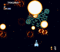 The 8 different weapons are obtained by collecting a circle with a number on it. From Weapon 1 to 8, the names are: Multiple Shot, Laser, Multi-Directional Shot, Missile, Circle, Power Shot, Scatter and Sprite. Smart bombs are also included in the game, killing almost everything on screen when activated.