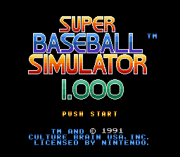 Super Baseball Simulator 1.000 is a baseball game released for the Super Nintendo in 1991. In addition to containing the typical options of season play and exhibition play, it also includes an edit-a-team mode and Ultra Leagues. In edit mode the player can name their team, choose the uniform colors, name every character, assign their stats, as well as choose from a wide variety of super powers each player may wield. In addition to the Ultra League, there are two leagues of standard baseball teams.