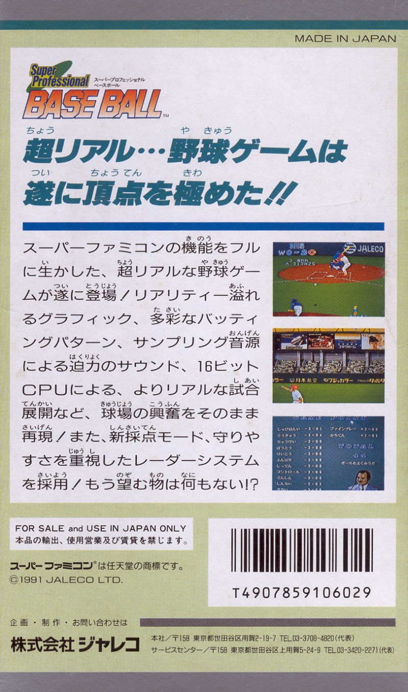 | description | The fifth installment of Jaleco's Bases Loaded franchise and the first developed for Super Nintendo. Its cover art features Chicago Cubs' Second Baseman Ryne Sandberg's autograph and likeness. |