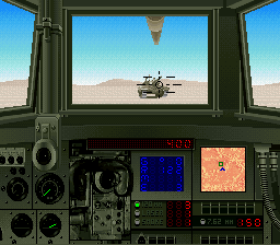 Super Battletank: War in the Gulf is a 1st person tank simulation. Players sit in the cockpit of a M1 Abrams tank. Controls allow the player to accelerate forward, decelerate, rotate the tank's trajectory left and right, move the tank's cannon left and right, fire the weapon and check the map. The goal of the player is to travel to the location of enemy targets, line them up with the Abrams cannon and fire upon them until destroyed. Each mission covers a large area of land and the player will need to consult the real-time map to travel appropriately to target locations. The M1 Abrams tank also features 2 special weapons: The laser which is more powerful than regular cannon, and the smoke screen which allows the player to escape. |