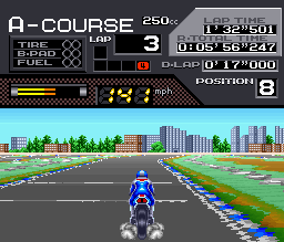 The player can race around a total of five different tracks in Time Trial Mode, Practice Mode and a competitive 2 Player Mode. There are also numerous options for bike customization, including engine size, bike color and options for optimizing either the acceleration, handling or top speed.