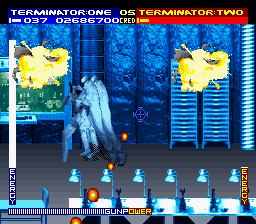 Terminator 2: Judgment Day, renamed T2: The Arcade Game for home conversions, features seven levels based on specific scenes or general concepts in the film. The first four levels act as a prelude, as the player guns down waves of metal Terminators across a post-apocalyptic Battlefield, a besieged Human Hideout, and through the security checkpoints of the enemy supercomputer SkyNet. After destroying the computer, players travel back in time to protect John and Sarah Connor, while also destroying every scrap of SkyNet research at the headquarters of its manufacturer. From there, players must fend off the indestructible T-1000 until the final showdown in the Steel Mill.