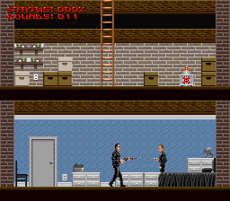 The first of two home system games based on the 1991 movie of the same name. Unlike the Arcade on-rails shooter and its ports, this LJN/Ocean home version is a side-scrolling action game.
