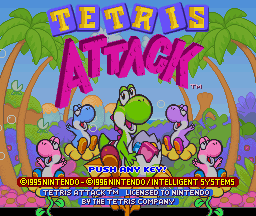 Tetris Attack is a fact-paced action puzzler featuring the colorful cast of characters from Yoshi's Island. A stack of blocks continually rises from the bottom of the screen, and the player controls a cursor which can swap any two blocks horizontally. Make a row or column of three or more and they'll clear, potentially creating combos from new blocks falling to take their place. Combos will send large garbage blocks to your opponent, which must be eliminated by clearing a piece that is touching it, turning it into normal blocks.