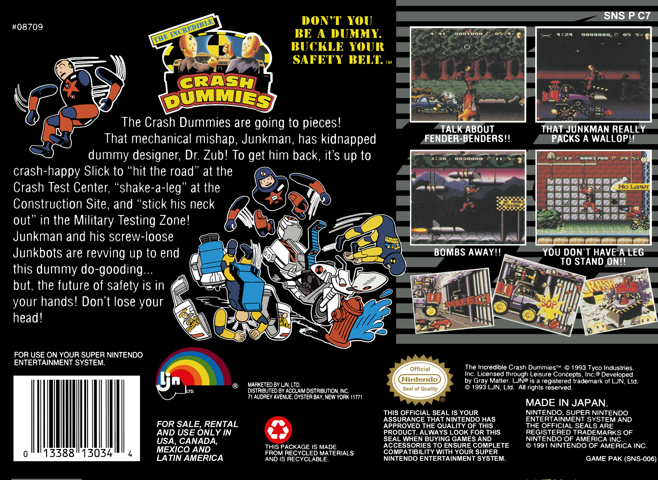 | description | The Incredible Crash Dummies capitalizes on the early '90s popularity of the Crash Dummy characters. Players are able to smash and trash the Dummies, running them through test tracks and stunts. |