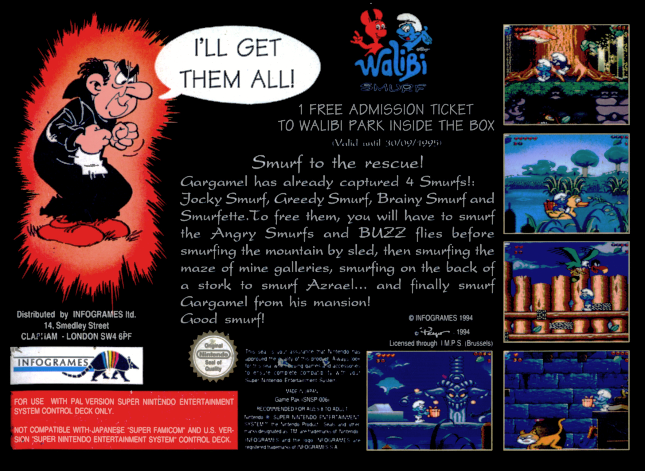 | description | A platformer based on the Belgian comic book of the same name about a tribe of peaceful tiny blue creatures and their frequent run-ins with the evil wizard Gargamel. It was released on multiple consoles in 1993. |