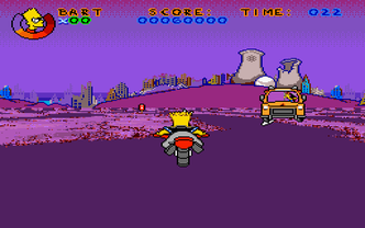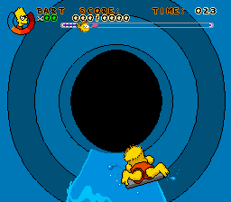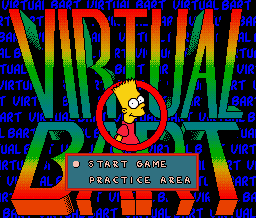 Virtual Bart was one of the many Simpsons games released on back in the early 1990s. In this game the player assumes the role of Bart Simpson who, while walking through the Springfield Elementary Science Fair, stumbles onto a virtual reality machine. Like the cool dude he is, Bart decides to give it a try, and that's pretty much the set up for the game. The VR machine is actually a wheel-like torture device that Bart is placed in and then spun. The wheel is adorned with various level icons and whichever one Bart's heads is pointing towards when the wheel stops is the level he must complete. The levels vary in theme and gameplay style, but each start/end with a brief cutscene and also contain a brief cutscene should if they are failed.