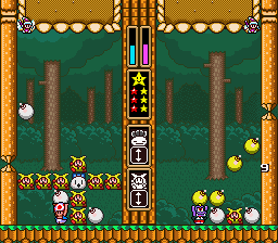 Wario's Woods is a puzzle game similar to Tetris or Columns, but with a twist. Instead of directly controlling the monsters and bombs that are falling down, the player controls Toad who has to carry around stacks of monsters and bombs and to combine them in the right way. One bomb plus at least two monsters of the same color have to be combined to make them disappear. If five or more objects are cleared at the same time, a diamond will appear. Destroying the diamond will clear all monsters of the diamond's color.