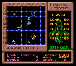 The starfighter ships come equipped with a computer, engine, shield, weapons, and missiles which can be damaged from enemy combatants or space debris like asteroids. The ship also comes with a Long Range Scanner, which shows the locations of enemies on the map. The map itself is made up of 64 square sections. Finally, the ship also has a Hyperwave Reciever, that lets the player communicate with both the aliens and the player's base.