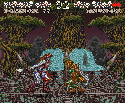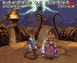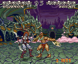 A barbarian battleground. Seven different warriors, eached armed with a unique weapon set forth on a fighting game quest where they will clash and conflict with one another in this fighting game from Namco. Their ultimate foe is the mysterious Demonlord. An early relative of the popular Soul Calibur series, the main claim to fame of this game is the weapon play. Blocking and combos are present along with special "frenzies" of increased attack and death combos. The backgrounds are all hand drawn and meticulously detailed. Each character carries their own storyline with them between arenas, jungles and firey mountains on a quest to oppose the Demonlord.