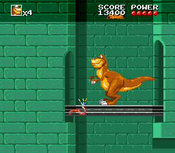 The gameplay is a side-scroller that has the player take control of Rex, traveling throughout the levels avoiding traps and defeating various enemies scattered throughout the stages (five in all). Rex can also receive help from his dinosaur pals, Elsa, Woog, Vorb, and Dweeb from time to time. There are also power-ups that increase and replenish Rex's health.