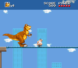 We're Back!: A Dinosaur's Story is different from its Genesis counterpart. This version features characters from the movie, but does not follow the storyline of the movie. In this version, Professor Screw Eyes has kidnapped Louie and Cecilia. Hearing of this, Captain Neweyes and the dinosaurs launch into action to save their friends by traveling through various time periods.