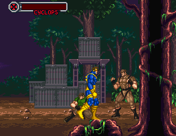 Each character has unique abilities and special moves: Cyclops uses his Optic Blast to attack enemies from a distance, Wolverine can climb walls, Psylocke is very agile and the best jumper of the team, Beast can cling to the ceiling while Gambit throws explosive cards at his enemies. Special moves are quite similar to those found in Street Fighter II (Wolverine has a Dragon-Punch-style attack and Gambit's Double Kick is virtually identical to M. Bison's Scissors Kick) and require similar button combinations.