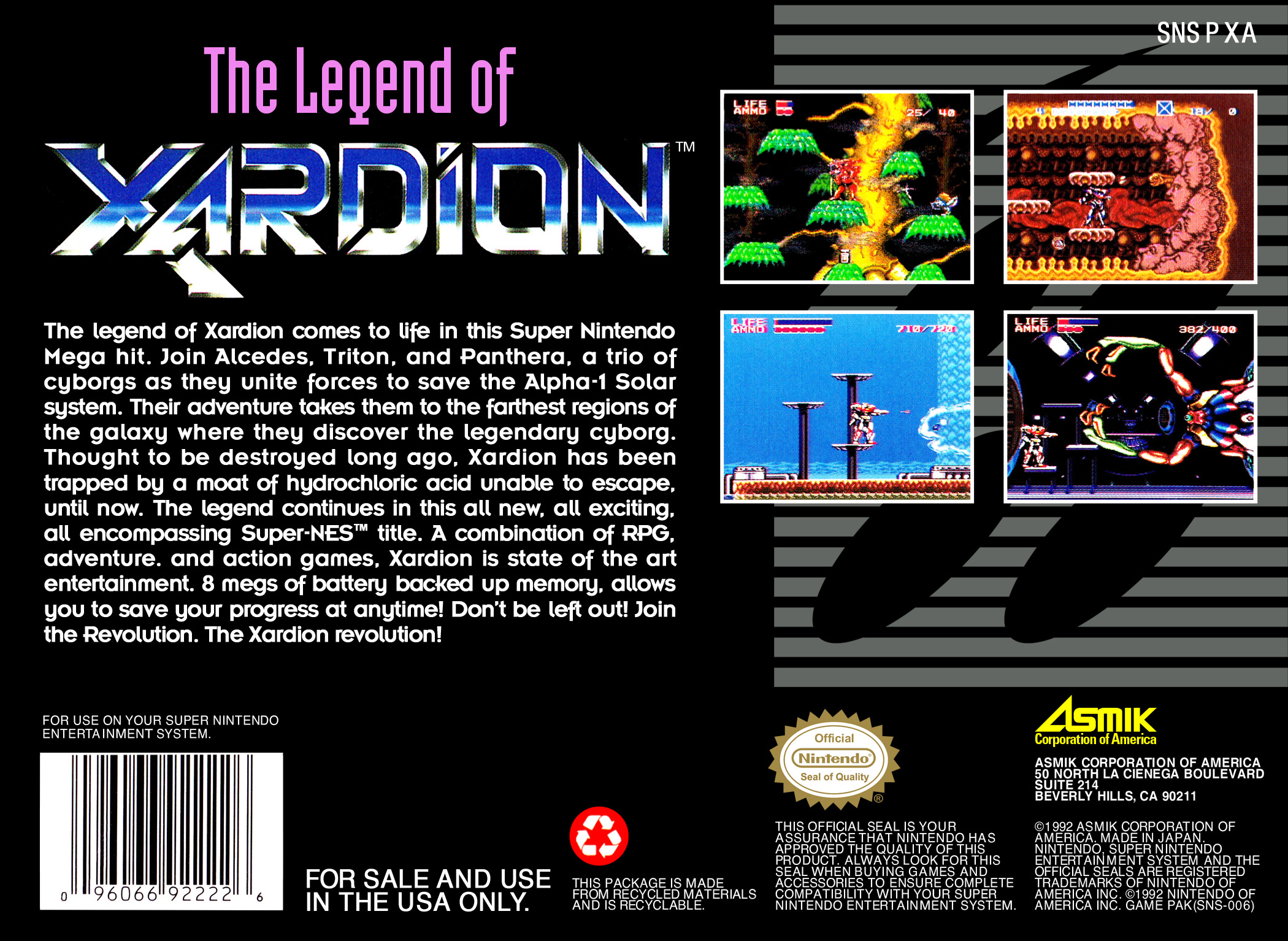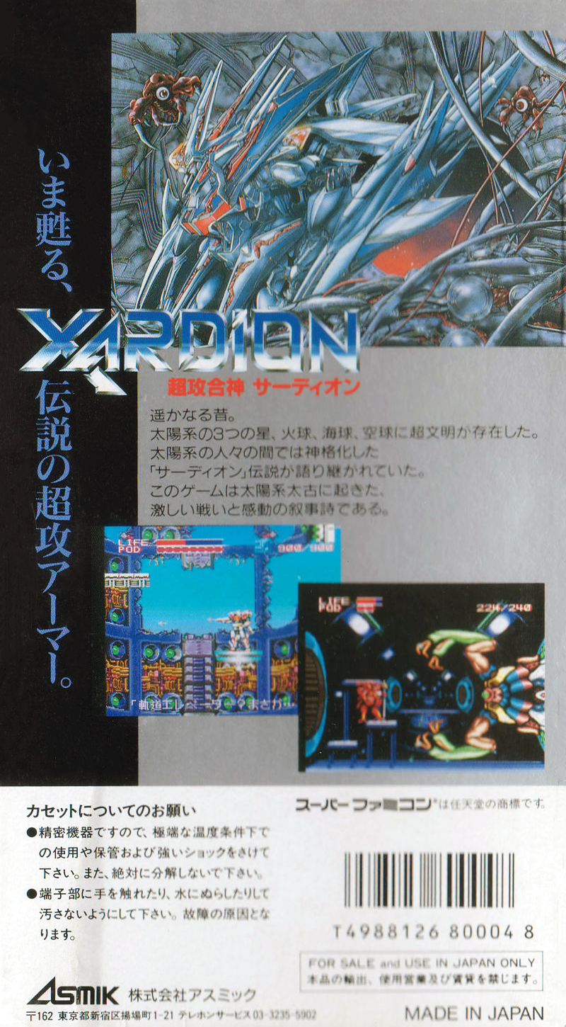 | description | Xardion is an Asmik-developed, side-scrolling action-adventure game. In this title, players take control of three unique robots as they defend their homeworlds from an intergalactic invader. |