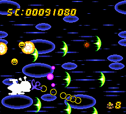 | __long_description | Air Zonk is similar to other scrolling shooters, but has a large number of power-ups and companion characters. Artistically the game is typically lighthearted, featuring humorous bosses such as a sentient garbage heap and an anthropomorphic boat. The gameplay centers around the effective use of shooting and bombing to complete a stage. At the start, the player must pick a companion character to team up with to perform special attacks. Air Zonk takes on the distinct visual style that is sometimes called "cute 'em up". There are three difficulty levels: sweet, spicy, and bitter.